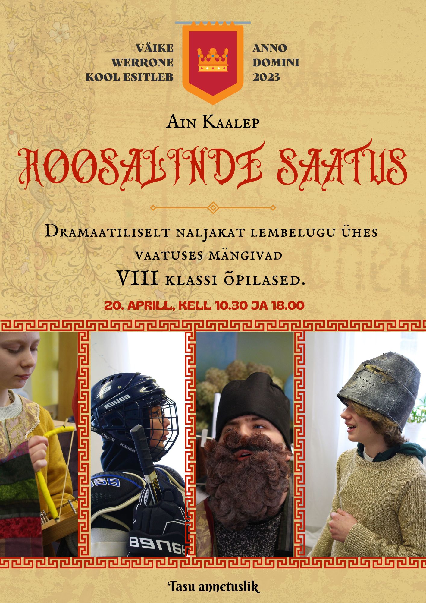 Meil on suur rõõm teatada, et meie kooli õpilased esitavad Ain Kaalepi näidendit “ROOSALINDE SAATUS” ning kutsume teid kõiki sellest osa saama! Etendused toimuvad Väike Werrone Kooli saalis 20. aprillil kell 10.30 ja kell 18.00.