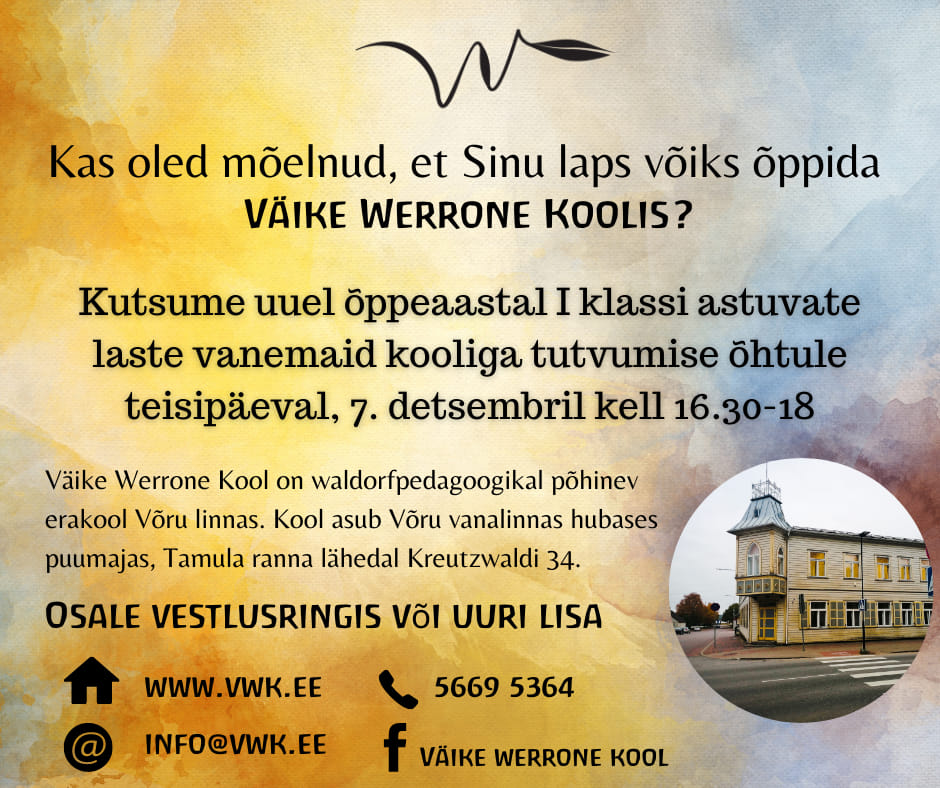 Share Share Share Share Share Share Share Kutsume lapsevanemaid kooliga tutvuma 24. nov. 2021 7.detsembril 2021 on võimalus tutvuda Väike Werrone kooliga.
